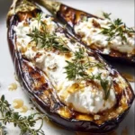 7. Servez : Une fois les aubergines cuites, sortez-les du four. Laissez-les tiédir quelques minutes. Déposez chaque moitié d’aubergine sur une assiette. Nappez généreusement de crème de feta fouettée. Vous pouvez ajouter un filet de miel supplémentaire ou quelques feuilles de thym frais pour la décoration. Servez ce plat tiède.