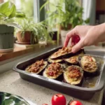 R : Salez légèrement les aubergines évidées et laissez-les dégorger 15–20 minutes, puis essuyez l’excès d’eau avant cuisson.