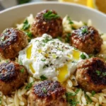 Savoureuses boulettes grecques juteuses servies avec un orzo léger au citron et une délicieuse crème de feta.