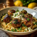 Servez les boulettes immédiatement après la cuisson, posées sur l’orzo citronné. Ajoutez une généreuse cuillerée de crème de feta sur le dessus. Parsemez de persil ou de menthe hachée et, si vous aimez, ajoutez quelques olives noires et des quartiers de citron à côté. Ce plat accompagne bien une salade verte ou des légumes rôtis.