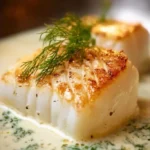 Un plat élégant de cabillaud nappé d’une sauce onctueuse au beurre blanc, rehaussé d’aneth frais et de jus de citron.