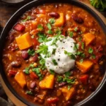 Cette recette transforme la purée de citrouille en ingrédient principal d’un chili savoureux. Elle apporte de la texture, des fibres et une petite touche sucrée qui équilibre les épices. C’est une option végétarienne rassasiante, économique et rapide à préparer.