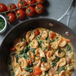 Un plat délicieux de crevettes en sauce crémeuse au parmesan et épinards, parfait pour un dîner rapide.