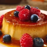 Servez le flan bien froid pour une meilleure tenue. Accompagnez-le de fruits rouges frais, d’un coulis sans sucre ou d’un peu de crème légère. Pour une présentation gourmande, saupoudrez d’un zeste d’agrume ou de cannelle.