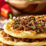 - Pendant ce temps, préparez la garniture : hachez l’oignon, l’ail, et les poivrons. Dans une poêle, faites revenir ces légumes avec un peu d’huile d’olive, ajoutez la viande hachée et laissez cuire. Incorporez ensuite la tomate concassée, le sumac, le chili, le sel, le poivre, et le persil.