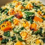 L’Orzo crémeux aux butternuts et épinards marie la douceur de la courge butternut à la texture ronde de l’orzo et à la fraîcheur des épinards. Si vous aimez les recettes d’orzo riches et savoureuses, essayez aussi l’orzo citronné crémeux à la feta pour une autre variation aux accents méditerranéens.