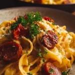 Pâtes crémeuses au chorizo servies dans un plat élégant