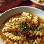 Pâtes Façon Soupe à l’Oignon Française est idéale quand on veut un plat complet et réconfortant sans passer des heures en cuisine. Si vous aimez les saveurs de soupe maison, pensez aussi à découvrir la soupe au pistou aux légumes, qui propose une autre façon saine et parfumée d’utiliser du bouillon et des légumes.