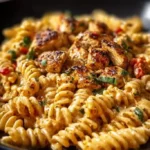 Un plat savoureux de pâtes rotini au poulet assaisonné d’épices cajun dans une sauce crémeuse, parfait pour des dîners réconfortants.