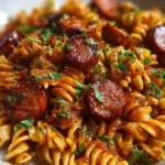 Un plat réconfortant de pâtes avec des saucisses BBQ épicées, parfait pour un dîner convivial ou un repas rapide en semaine.
