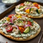 Préparez la pâte, étalez le tzatziki comme base, puis ajoutez le poulet et les garnitures froides. Enfournez jusqu’à ce que la croûte soit dorée. La cuisson courte préserve la texture du concombre et la fraîcheur du tzatziki.