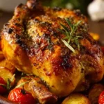 Un poulet rôti croustillant et juteux, assaisonné avec de l’ail, du citron et des herbes de Provence, idéal pour un repas familial.