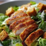 Servez la salade bien fraîche, immédiatement après avoir ajouté la sauce pour préserver le croquant des croûtons et du poulet. Accompagnez d’un filet de citron supplémentaire et d’un tour de moulin à poivre. Pour un repas complet, proposez un pain grillé ou une soupe légère en entrée.