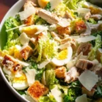 Cette recette allie simplicité et goût : un poulet bien grillé, de la laitue croquante, du parmesan fondant et des croûtons croustillants. Elle convient pour un déjeuner rapide, un dîner léger ou comme plat principal lors d’un repas entre amis.