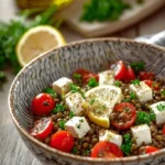 Une salade saine et savoureuse de lentilles avec de la feta marinée, parfaite pour un déjeuner léger ou un accompagnement.