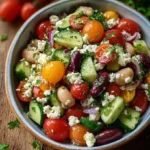 La salade de pois chiches à la grecque est simple, colorée et pleine de goût. Elle combine la rondeur des pois chiches, la fraîcheur des légumes et la douceur salée de la feta. Pour varier vos repas et trouver d’autres idées d’accompagnements méditerranéens, découvrez aussi la recette de cabillaud au four moutarde-crème citronnée qui complète parfaitement ce type de salade.