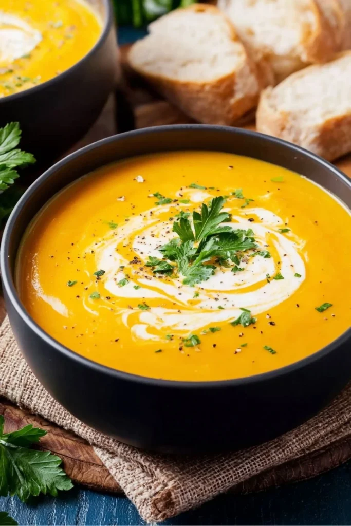 Cette soupe de courge musquée est naturellement riche en bêta-carotène, en fibres et en antioxydants, ce qui en fait un choix excellent pour un déjeuner végétarien sain.