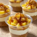 Préparez vos pommes en les pelant et coupant en dés. Faites-les caraméliser doucement dans une poêle avec du beurre, du sucre brun et de la cannelle jusqu’à ce qu’elles soient tendres et légèrement dorées. Laissez tiédir, puis montez les tasses en alternant couches de pommes et de crème fouettée. Terminez par un filet de sauce caramel et réservez au frais avant de servir.