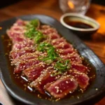 Tataki de bœuf mariné présenté sur une assiette élégante